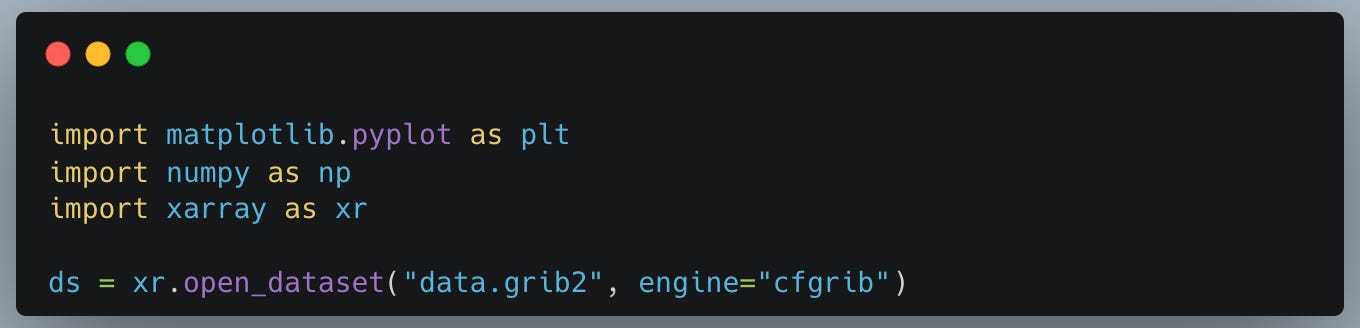 Reading the data (assuming cfgrib is installed as additional xarray dependency) is as easy as